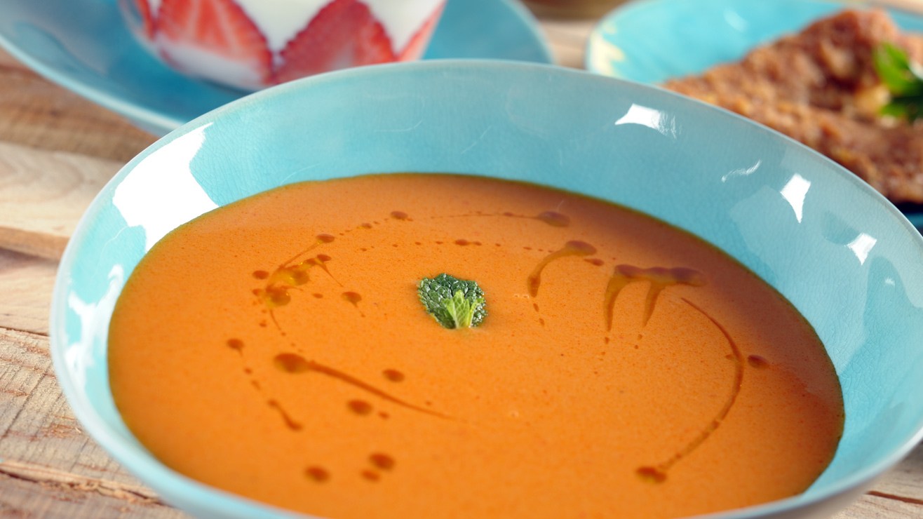 En una cacerola con el aceite acitronar a fuego bajo la zanahoria, el ajo y la cebolla por 3 minutos. Verter el caldo de pollo y la ramita de romero; dejar hervir por 5 minutos. Licuar muy bien, regresar a la cacerola y calentar antes de servir.