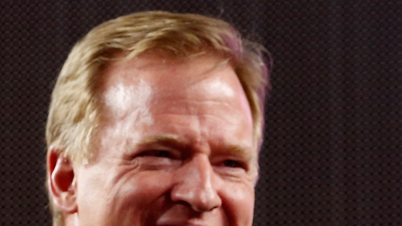 El comisionado de la NFL, Roger Goodell, y el dueño de los Patriots, Robert Kraft, sonríen en el podio tras el pasado Super Bowl en Arizona.