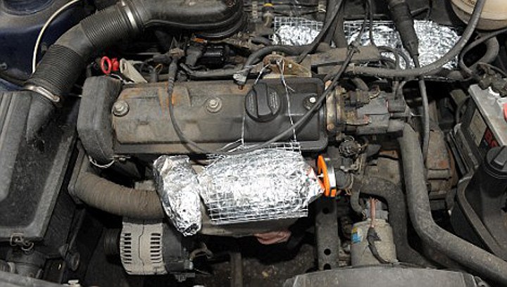 Asegúrate de que el papel de aluminio envuelva bien y ponlo en el sitio más caliente del compartimiento del motor. Coloca la bolsa de aluminio firmemente en esa sección caliente de manera que no se mueva, tal vez incluso puedes asegurarla con un poco de alambre de metal. Conduce hasta que la comida esté lista y así no tendrás que parar en ningún restaurante.