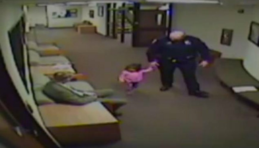 En las imágenes, que fueron captadas por las cámaras de seguridad del juzgado, se ve cómo Abi corretea por la salita hasta que su papá intenta entrar a la sala del tribunal con ella. Luego, el oficial se ofrece a cuidarla y pasea de la mano con la pequeña para entretenerla durante la espera. Más tarde, ambos se sientan y el policía le muestra dibujos animados en su teléfono móvil.