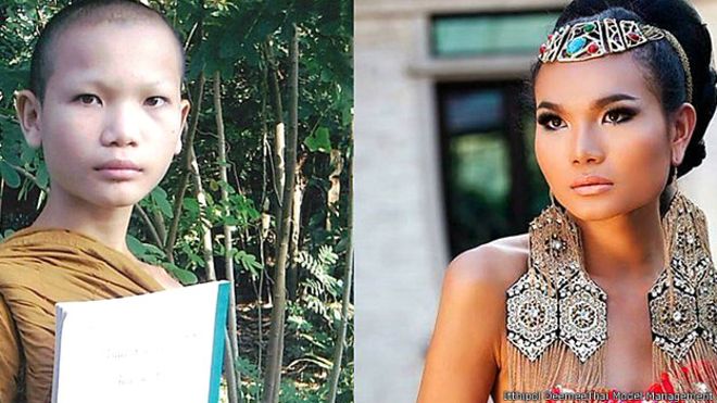 Cuando nació varón recibió el nombre de Phajaranat Nobantao. “Cuando mis padres enfrentaron muchas dificultades económicas me enviaron a un templo budista. Allí pasé un período de entrenamiento, en el que nuestros maestros querían saber si teníamos suficiente paciencia, ganas de aprender y deseos de seguir las enseñanzas de Buda“, dijo la modelo al programa Outlook de la BBC.
