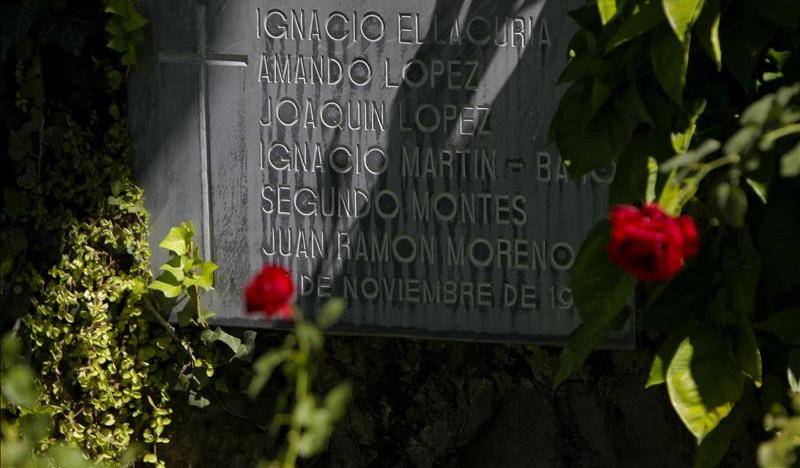 Detalle de una placa en el 'Jardin de la Rosas' con los nombres de los seis sacerdotes jesuitas, cinco de ellos españoles, asesinados en 1989. Crédito: Archivo | EFE