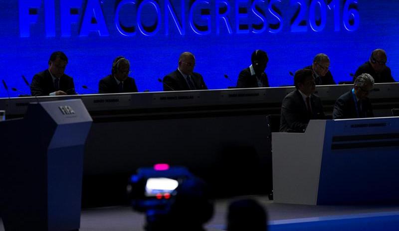 El Consejo Ejecutivo de la FIFA en el estrado durante la celebración del Congreso Extraordinario de la FIFA en el Hallenstadion de Zúrich.  Crédito: EFE