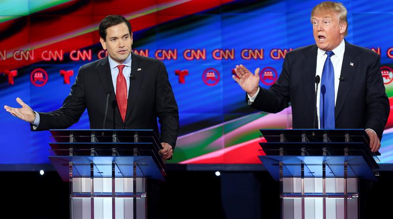 El aspirante a candidato presidencial por el partido republicano Donald Trump (dcha) y su contrincante Marco Rubio (izda) asisten al décimo debate televisado entre aspirantes republicanos a la Casa Blanca. Crédito: EFE