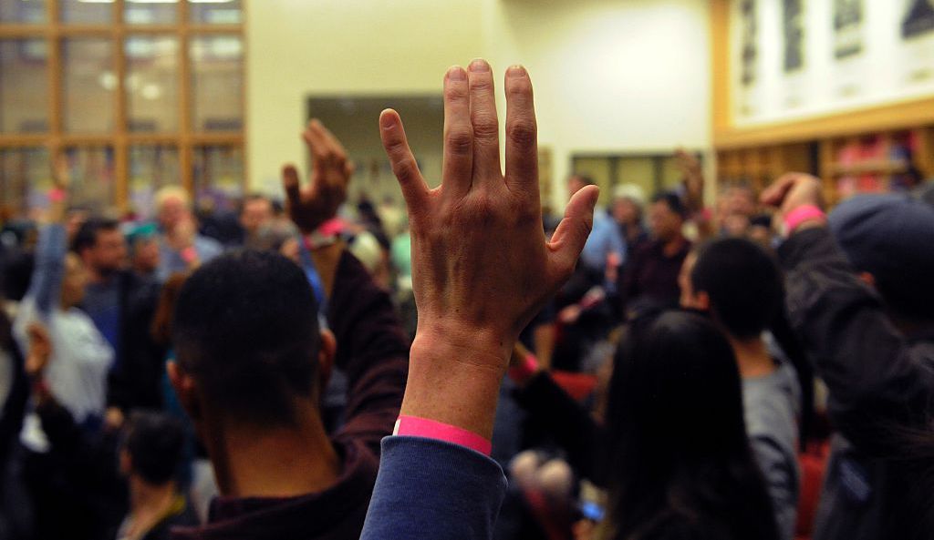 Votantes participan en en el caucus demócrata en la Escuela Secundaria del Norte en Denver, Colorado. Crédito: JASON CONNOLLY/AFP | Getty Images