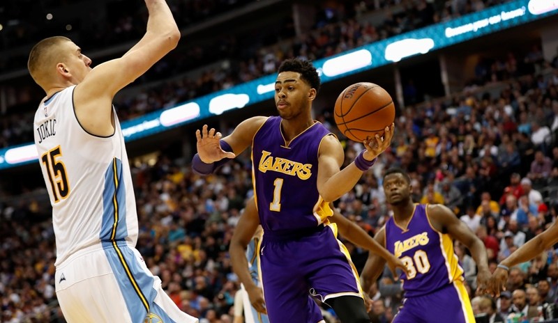 Una noche después de que les abrió los ojos en serio por primera vez a los aficionados de los Lakers al anotarle 39 puntos a Brooklyn, incluyendo ocho canastas de tres puntos, el novato D’Angelo Russell fue dejado en 24 unidades y los Nuggets ganaron 117-107 el miércoles.