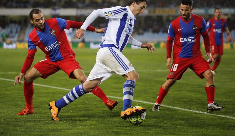 El Levante, que se jugaba buena parte de la permanencia en este partido porque llegaban a este choque a seis puntos del Rayo, hicieron un planteamiento timorato, cedieron el balón a los donostiarras y esto les salió caro de inicio.