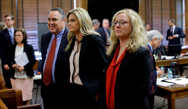 La periodista deportiva Erin Andrews ante el jurado en una foto tomada el pasado 4 de marzo en Nashville, Tennessee. Crédito: Mark Humphrey | Getty Images