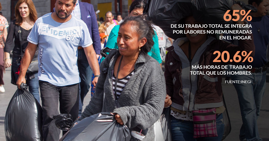 “En la actualidad predomina todavía en México el modelo bajo el cual las tareas domésticas se asignan a las mujeres y las extradomésticas a los hombres. Lo anterior, sumado al creciente fenómeno de incorporación de las mujeres al mercado laboral, les ha generado una sobrecarga de trabajo, debido a que ellas siguen siendo las principales responsables de las actividades domésticas y de las actividades de cuidado al interior de los hogares, sin que haya corresponsabilidad por parte de los otros integrantes de la familia, de las empresas y sociedad en general”, señala el Inegi al respecto.