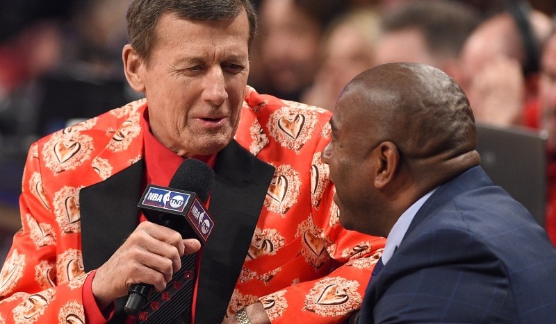 Craig Sager, aquí entrevistando a Magic Johnson, es mejor conocido por sus coloridos trajes. Crédito: Getty Images