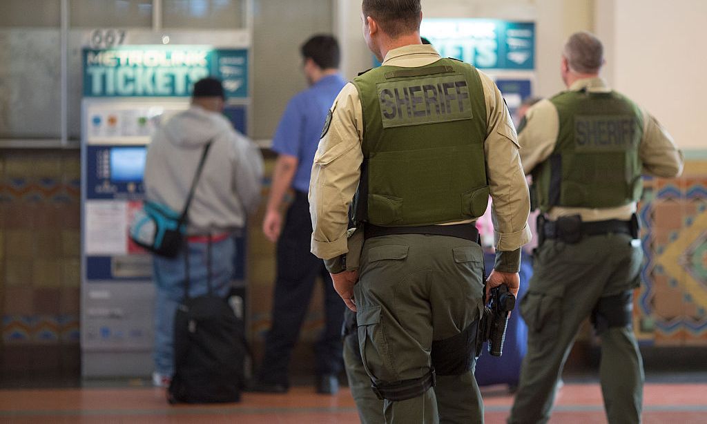 Alguaciles del Sheriff de Los Ángeles patrullan Union Station hoy, tras los ataques terroristas ocurridos en Bruselas, Bélgica. Crédito: David McNew | Getty Images