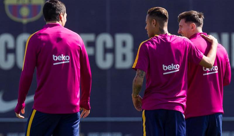 El tridente del Barcelona durante el entrenamiento: Luis Suárez, Lionel Messi y Neymar. Crédito: EFE