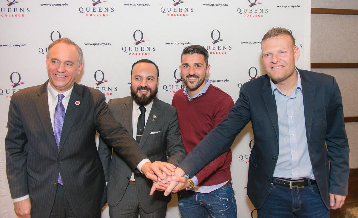 David Villa, de rojo, durante la presentación del curso. en Queens College. Crédito: Cortesía