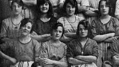 A primera vista, se ve a un grupo de 15 mujeres, la mayoría de pie, todas mirando a la cámara; algunas sonriendo.