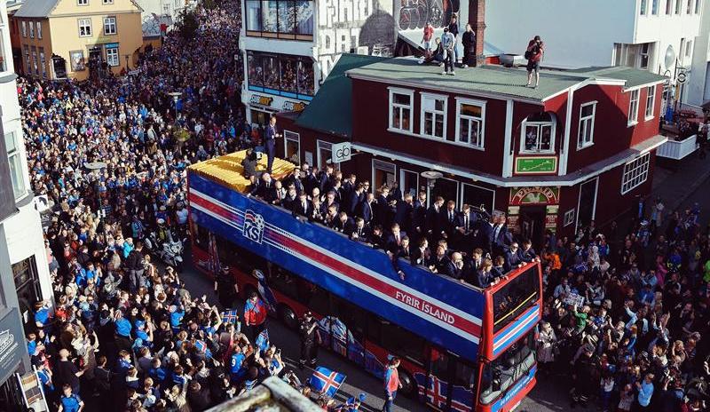 La selección islandesa transitó en un autobús de dos plantas con el techo descubierto el centro de la capital, repleto de gente que aplaudía y vitoreaba al equipo que tuvo una actuación sobresaliente en su primera participación en una fase final.