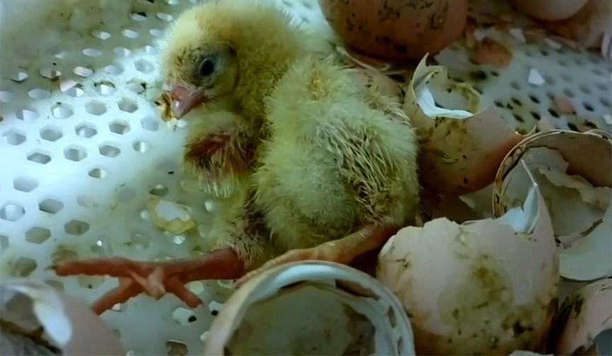 Un pollito recién nacido. Imagen tomada del video de PETA. Crédito: PETA Latino