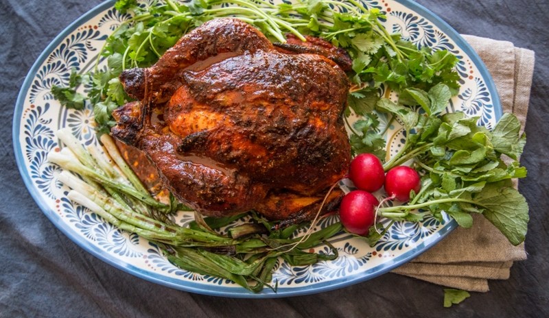 Coloca el pollo, con la pechuga hacia arriba, en el lado opuesto al calor directo de la parrilla. Tapa la parrilla y asa hasta que el pollo esté cocido, aproximadamente 1 hora y media, volteando el pollo a la mitad de tiempo (si usas una parrilla de carbón, agrega un par de puñados de carbón cada media hora para mantener el calor).