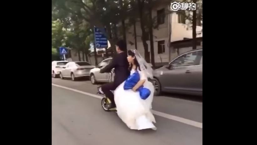 Un video difundido en redes sociales muestra el momento en que la fémina, que acababa de contraer matrimonio con el hombre que conducía la moto, se cae de la parte trasera de ésta sin que su compañero se percate del incidente.