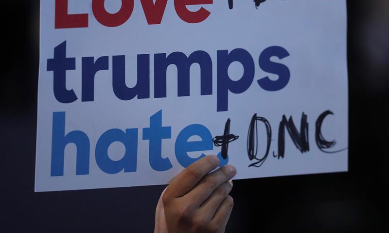 Pancarta en Convención Demócrata Nacional. Crédito: EFE