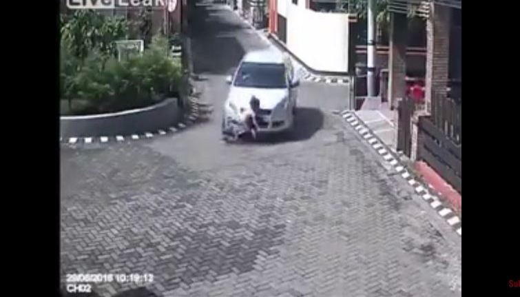 Una cámara de videovigilancia en Indonesia captó el momento justo en que una pequeña es atropellada accidentalmente por un auto.
