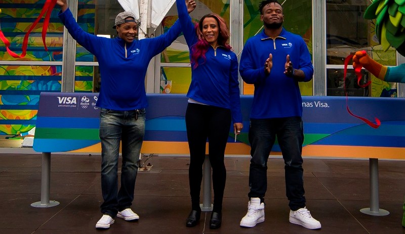 Los judokas congoleses Yolande Mabika y Popole Misenga posan con la atleta paralímpica Terezinha Guilhermina en Río de Janeiro, Brasil. Crédito: Getty Images