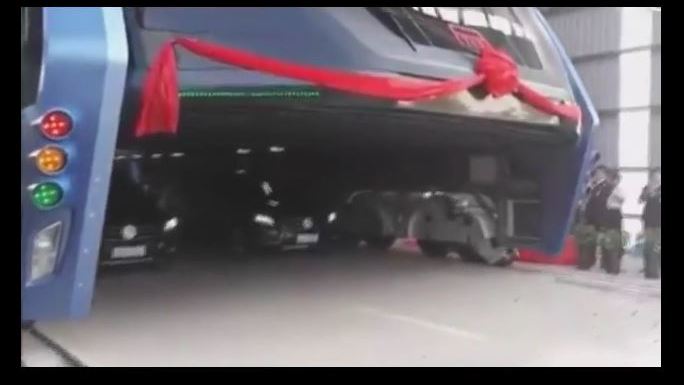 Parece ciencia ficción. En medio de un enorme atasco en una autopista, un gigantesco autobús se eleva a más de dos metros de altura para avanzar por encima de dos carriles llenos de vehículos.