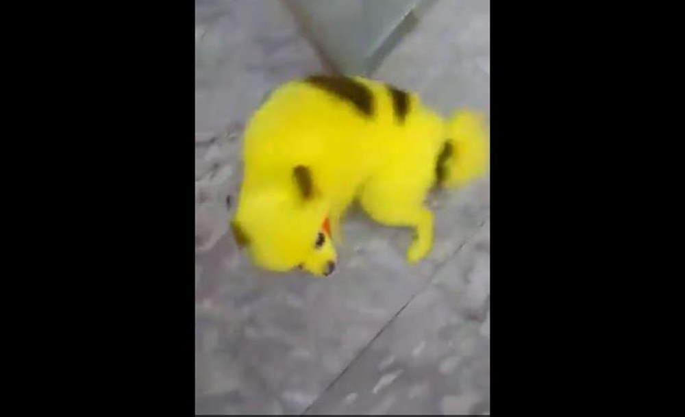 Se trata de un perro que parece de raza Pomerania pintado por completo de amarillo con manchas negras, emulando a Pikachu, el célebre personaje de animación resucitado por Pokémon Go.