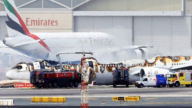 El Boeing 777-300 de Emirates Airlines, vuelo EK521, yace en la pista del Aeropuerto Internacional de Dubai, tras ser destruido por un incendio debido a una falla mecánica que forzó un aterrizaje de emergenciaImage copyrightEPA Image caption El Boeing 777-300 de Emirates Airlines, vuelo EK521, yace en la pista del Aeropuerto Internacional de Dubái, tras ser destruido por un incendio. Crédito: EFE