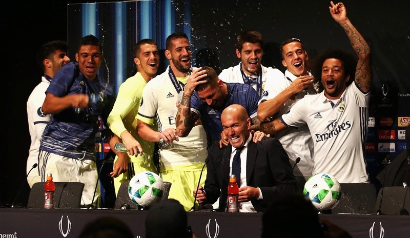 Varios jugadores del Real Madrid interrumpieron hoy la rueda de prensa de su técnico, Zinedine Zidane, celebrada tras el triunfo del equipo en la Supercopa de Europa contra el Sevilla, y bañaron al entrenador blanco.