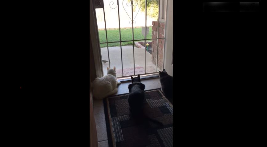 Mientras los felinos están concentrados observando a través de la ventana a un pajarito que se encuentra fuera de la residencia donde viven las mascotas, el perro aparece sigilosamente.