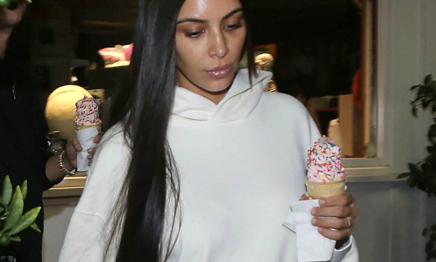 En lugar de los escotes y mallas ajustadas que suele lucir, Kim salió a comprar yogur helado luciendo una sudadera XXL y absolutamente nada de maquillaje.