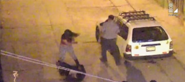 Las cámaras de seguridad registraron el momento en que la fémina empuja al individuo al suelo y lo empieza a patear.