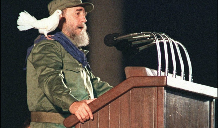 En el 30 aniversario de la revolución cubana,en 1989, Castro se dirigió a la nación con esta paloma blanca en el hombro.