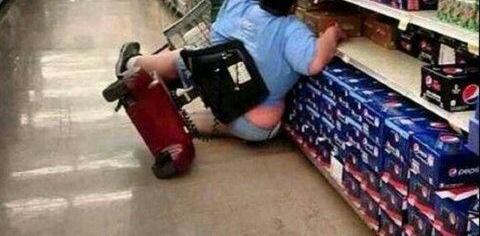 La estadounidense que padece obesidad se le ve de espaldas cayendo al suelo desde su silla eléctrica en un establecimiento Walmart mientras intentaba agarrar un artículo.