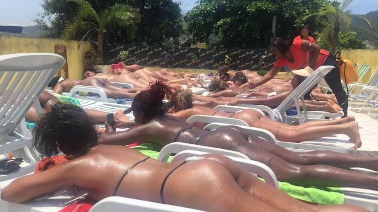 El día a día se desarrolla con alrededor de 30 mujeres que pagan poco más de 20 dólares para tomar el sol durante unas tres horas -hora y media de frente y otro tanto de espaldas- mientras hablan con otras clientas, miran el teléfono móvil, les sirven agua y les mojan con pequeñas bombas de agua para aplacar el calor.