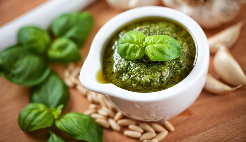 Según la tradición, los ingredientes del pesto genovés son siete: hojas tiernas de albahaca y perejil; aceite de oliva extra virgen; piñones; queso seco, del tipo parmesano o Grana Padano; queso pecorino; ajo y sal marina gruesa. Crédito: Shutterstock