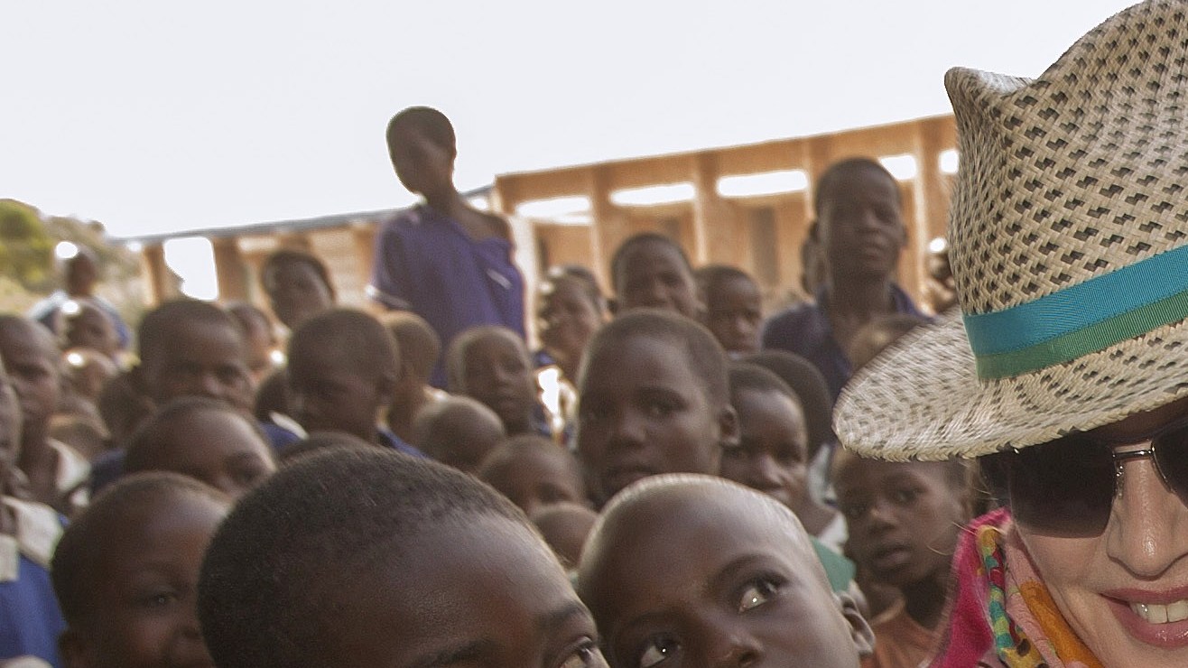 Madonna sentada junto a niños malawíes durante su visita a la primaria Mkoko, una de las escuela construidas por Raising Malawi, la fundación de la cantante. Crédito: AMOS GUMULIRA | AFP/Getty Images