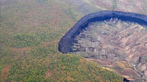 El cráter va quedando al descubierto con el derretimiento del hielo en el suelo permanentemente congelado ( permafrost o permahielo ) de esta región.