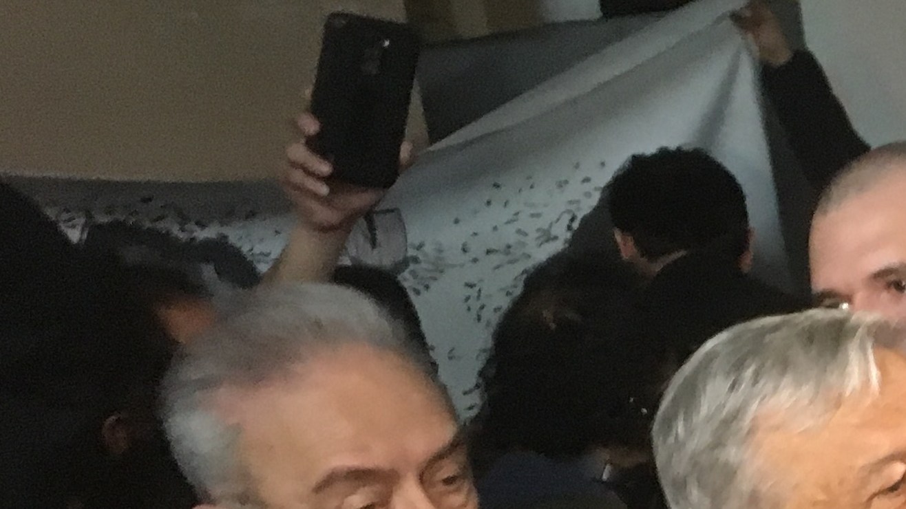 La trifulca, que a todas luces estaba a punto de salirse de control, comenzó cuando una mujer mostró una pancarta con fotos de López Obrador con José Luis Abarca, el expresidente municipal de Iguala, Guerrero, donde desaparecieron los 43 normalistas en septiembre de 2014.