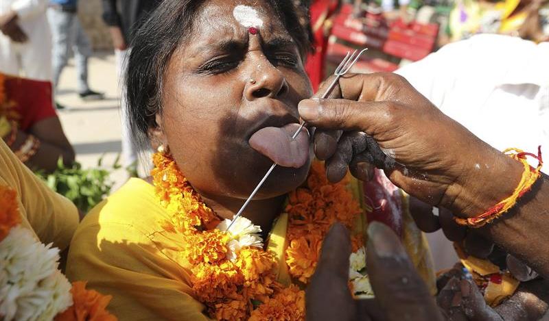 Una mujer sufre una perforación en sacrificio para la diosa sacrificio diosa Mariamman. Crédito: EFE