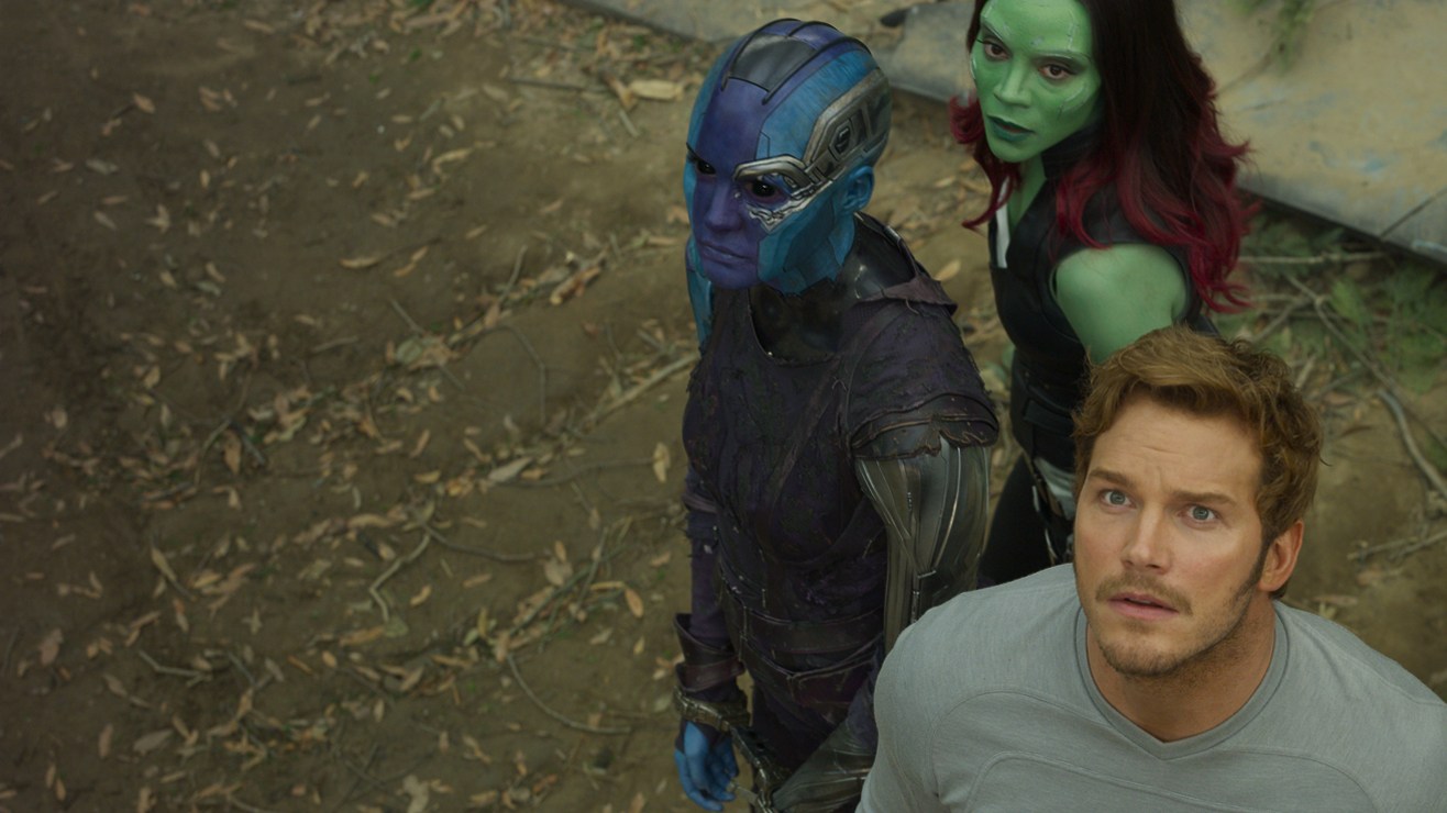 Chris Pratt (centro) y Zoe Saldaña (de verde) en una escena de Guardians of the Galaxy Vol. 2. Crédito: Marvel Studios 2017