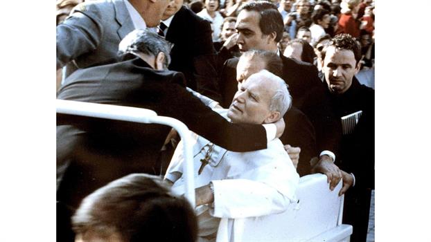 En ese momento, el terrorista Ali Mehmet Agca, que se encontraba en la plaza de San Pedro , le disparó cuatro tiros, de los cuales dos alcanzaron al Sumo Pontífice. Uno le hirió en la mano izquierda, le perforó el bajo vientre, atravesó el hueso sacro y se incrustó en el piso del “papamóvil”. El proyectil pasó a pocos milímetros de la arteria aorta y rozó la espina dorsal del papa. El otro proyectil le rozó un codo e hirió a dos mujeres.