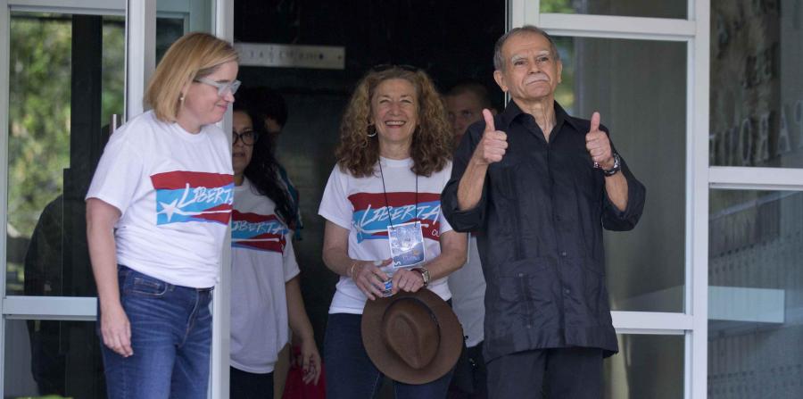 López, de 74 años, estuvo custodiado por la alcaldesa de San Juan, Carmen Yulin Cruz, la concejal Melissa Mark Viverito y su abogada Jan Sussler. Su séquito llevaba unas camisetas que leían: “Libertad”.