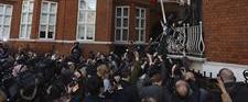 Julian Assange se dirigió a los medios de comunicación desde el balcón de la embajada ecuatoriana en Londres para celebrar el cierre del caso de presunta violación contra él. Crédito: Facundo Arrizabalaga | EFE
