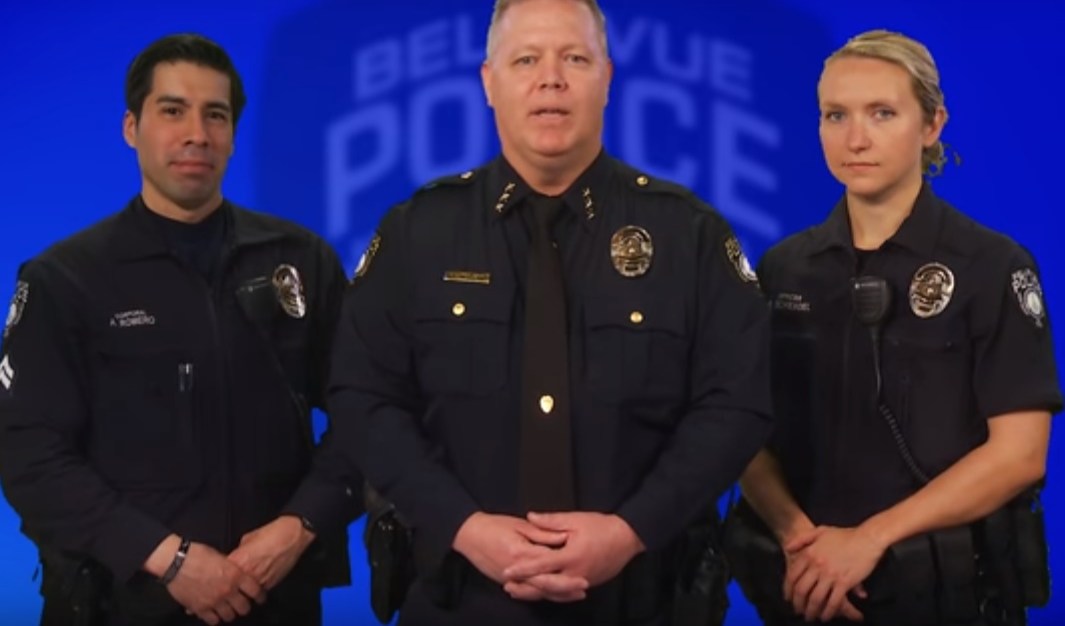 Incluso ofrece su correo electrónico para cualquier duda: bellevuepd@bellevuewa.gov, para luego darle paso a dos oficiales que continúan el mensaje en español.