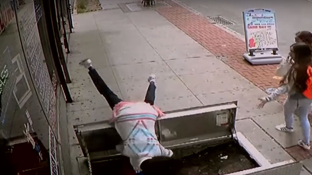 Las cámaras de seguridad de un negocio en Plainfield, Nueva Jersey, muestran el momento en que una mujer de 67 años que viene caminando por la acera se distrae mirando su celular y tropieza contras las puertas abiertas de una bodega subterranea, pierde el equilibrio y se abalanza, quedando unos segundo suspendida en el aire, hasta precipitarse dentro del lugar, cayendo desde una altura de poco más de seis pies.