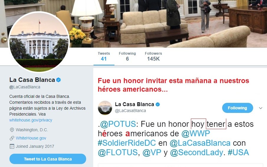 Aunque parece que existe una buena intención de la administración del presidente Donald Trump por realcionarse con la comunidad hispana a través de su idioma, el objetivo no tiene resultados positivos, ya que en la cuenta @LaCasaBlanca se escribe muy poco (y mal) en español y se retuitea mucho en inglés.