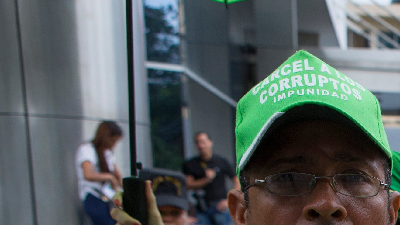 Miembros del colectivo dominicano Marcha Verde protestan frente a las oficinas de la empresa brasileña Odebrecht, en Santo Domingo (República Dominicana). Crédito: EFE