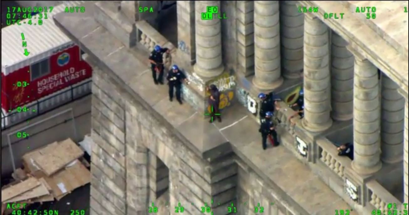 A su llegada, la Unidad de Aviación localizó al individuo e informó al equipo de ESU. En el video distribuido por la policía se ve que justo cuando el hombre se vuelve para dirigirse a dos oficiales a su derecha, otros se abalazan sobre él y logran controlarlo.
