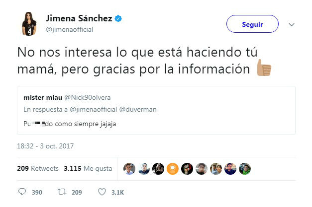 Jimena Sánchez respondió sutilmente a uno de sus detractores. La famosa conductora de Fox Sports comentó la publicación de un compañero –Jean Duverger– en referencia a un juego de su equipo de beisbol favorito cuando un fanático la insultó al escribir: “Put**ndo como siempre”, según reportó el portal mexicano esmas.com.